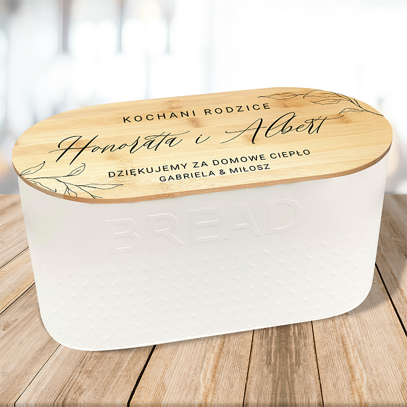 Aby podziękować ukochanym rodzicom, podarujcie im w podziękowaniu ślubnym personalizowany pojemnik na pieczywo. Chleb jako symbol dostatku i pomyślności, powinien mieć swoje wyjątkowe miejsce w kuchni. Do tego idealnie nadaje się nasz chlebak z cudowną dedykacją.