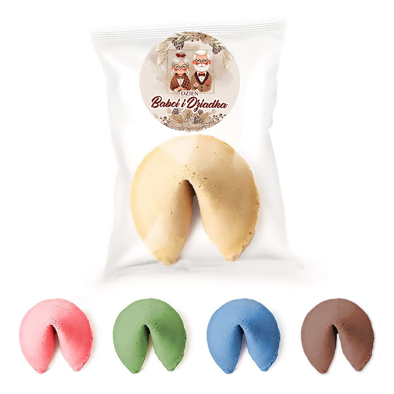 Paczka z ciasteczkami fortuny w różnych kolorach: różowym, zielonym, niebieskim i brązowym, z etykietą "Dzień Babci i Dziadka".