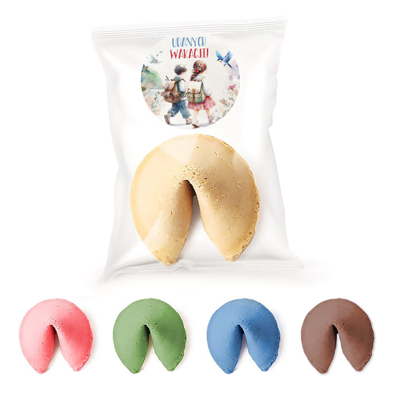 Zestaw 10 ciasteczek z wróżbą to pomysłowy i pełen uroku prezent na zakończenie roku dla dzieci, który z pewnością sprawi im mnóstwo radości. Każde z ciasteczek skrywa w środku zabawną lub motywującą wróżbę, dzięki której dzieci wkroczą w wakacje z uśmiechem i pozytywną energią. To idealna niespodzianka na zakończenie wspólnej nauki, która nie tylko smakuje, ale także bawi i inspiruje. Do wyboru jest kilka kolorów ciasteczek, każde z nich pakowane jest osobno w przezroczystą torebkę z uroczą grafiką dzieci z plecakami i napisem „Udanych wakacji!”. Zestaw 10 sztuk doskonale sprawdzi się jako prezent na zakończenie roku dla dzieci z jednej klasy lub grupy przedszkolnej.