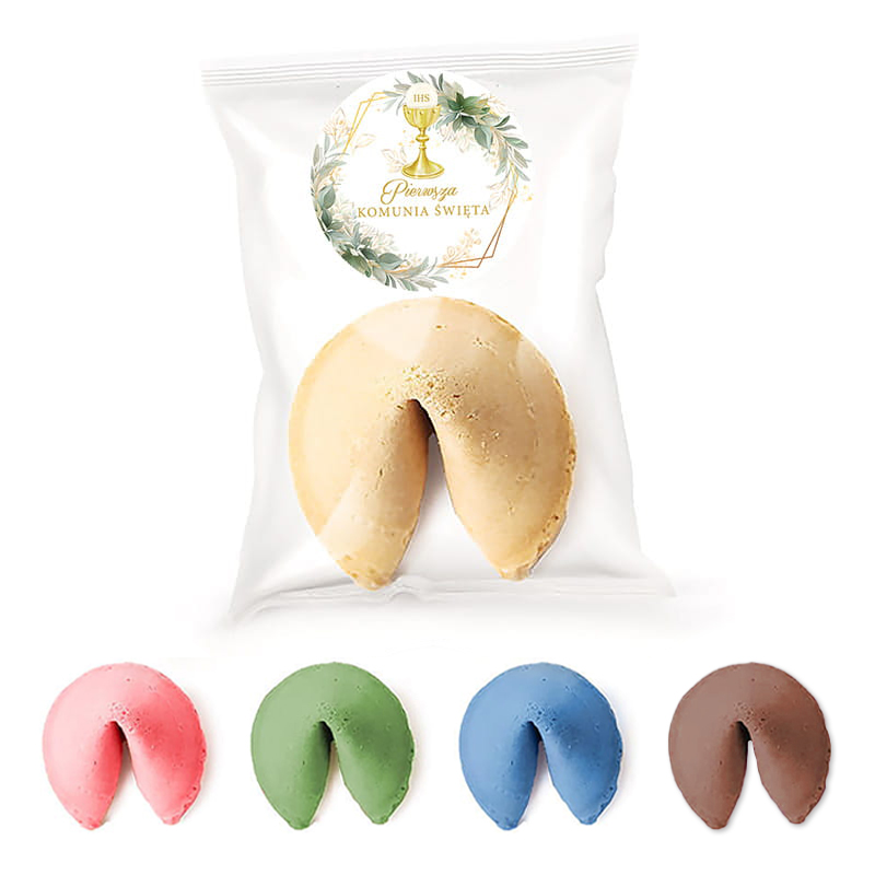 Zestaw zawiera 10 chrupiących ciasteczek z wróżbą, które wyróżniają się złocistą barwą oraz lekką, kruchą strukturą. Każde ciastko zostało starannie zapakowane w indywidualne foliowe opakowanie, które chroni jego świeżość i estetyczny wygląd. Na froncie widnieje naklejka z komunijnym motywem, dzięki czemu całość prezentuje się elegancko i idealnie komponuje się z dekoracją stołu. Na białym tle umieszczono złoty kielich z hostią, otoczony delikatnym, zielonym wieńcem. W centralnej części etykiety widnieje ozdobny napis „Pierwsza Komunia Święta”, który podkreśla uroczysty charakter upominku. Wewnątrz każdego ciasteczka kryje się karteczka z inspirującą wróżbą, która może stać się pięknym przesłaniem lub symbolicznym życzeniem dla bliskich. To doskonałe połączenie smaku i emocji, które sprawia, że prezent nabiera wyjątkowego znaczenia.