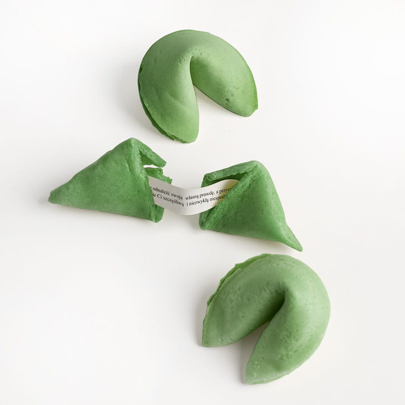 • Uwaga! Ze względu na elektryzowanie się papieru, bardzo sporadycznie może się zdarzyć, że wewnątrz ciasteczka znajdą się dwie karteczki z wróżbą lub w jakimś ciasteczku będzie brak wróżby.