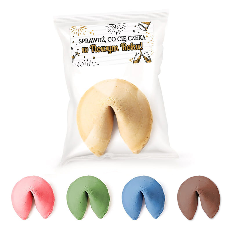 Ciasteczka z wróżbą noworoczną dostępne na naszej stronie internetowej to pełnowartościowy produkt, wykonany z wysokiej jakości składników. Słodkość w kształcie półksiężyca skrywa karteczkę z wróżbą lub miłym słowem na nadchodzący rok. Życzenia i myśli umieszczone w środku są uniwersalne, dlatego z powodzeniem będą dopasowane zarówno do kobiety, jak i mężczyzny w każdym wieku. Pojedynczy produkt znajduje się jest w przezroczystym opakowaniu, na którym umieszczona została charakterystyczna naklejka. Na środku możesz zobaczyć czarno-złoty napis SPRAWDŹ, CO CIĘ CZEKA W Nowym Roku! Całość dopełniają wzory kieliszków szampana oraz fajerwerków. Ciastka przygotowane zostały w pięciu kolorach: biszkoptowym, zielonym, czekoladowym, różowym i niebieskim. Tylko od ciebie zależy, na który się zdecydujesz.