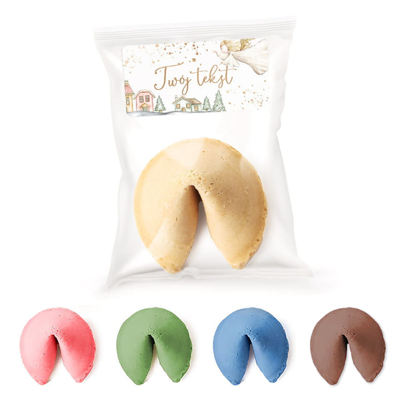 Ciasteczko znajduje się w przezroczystej folii, na której znajduje się prostokątna, samoprzylepna etykieta o świątecznej tematyce. Obrazek świąteczny na naklejce przedstawia aniołka, który wznosi się nad zimowym miasteczkiem, całość dopełnia Twój napis. Ciasteczka z wróżbą to wspaniały pomysł, aby zaskoczyć świątecznie rodzinę, przyjaciół czy kolegów z pracy. Ciasteczkami można wypełnić misy z bożonarodzeniowym poczęstunkiem lub podarować każdemu osobno.