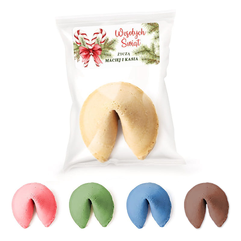 Ciasteczka z wróżbą to drobiazg, który będzie miłym zaskoczeniem dla gości, których poczęstujesz. Niespodzianka w postaci wróżby będzie prawdziwą atrakcją, a personalizowana etykieta niczym kartka świąteczna z pozdrowieniami. Kruche łakocie z wróżbą w środku sprawdzą się jako drobne upominki dla najbliższych, ale również w miejscu pracy zrobią furorę, gdy jako pomocnik Mikołaja podrzucisz każdemu na biurko. Możesz z ciasteczek zrobić świąteczny poczęstunek, wystarczy wysypać je do szklanych mis, aby każdy mógł samodzielnie się poczęstować. Jest to również dobra promocja dla firmy, dlatego wręczając ciasteczko świąteczne swoim kontrahentom, sprawisz wrażenie kreatywnej oraz serdecznej osoby.