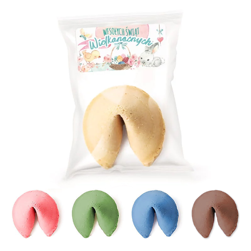 Kształt ciasteczka przypomina rogalika. Po przełamaniu Waszym oczom ukaże się dobra i radosna wróżba. Ciasteczko wielkanocne umieszczone jest w transparentnym opakowaniu. Dzięki temu od razu obdarowani będą widzieć, że otrzymali słodki upominek. Aby odbiór tej słodyczy na Wielkanoc był jeszcze bardziej pozytywny, a przy tym wpisywał się w klimat świąt, do opakowania dołączymy niezwykle piękną etykietę. Widać na niej grafikę zajączka, kurczaczka, ale też jajeczka w dużym koszu. Całość utrzymana jest w subtelnych kolorach takich jak różowy, żółty czy niebieski. Na etykiecie umieścimy napis Wesołych Świąt Wielkanocnych wykonany w dekoracyjnej czcionce.