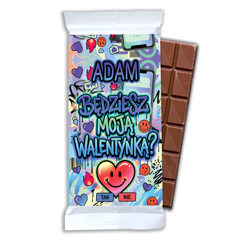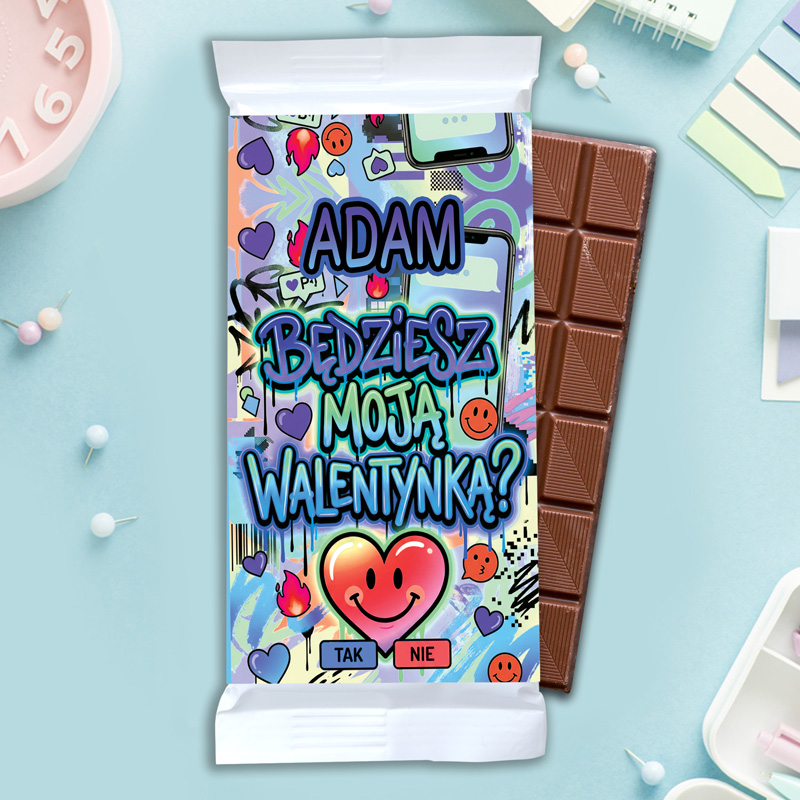 Czekoladowa tabliczka w kolorowym opakowaniu z napisem "ADAM BĘDZIESZ MOJĄ WALENTYNKĄ?" oraz sercem i emotikonami.