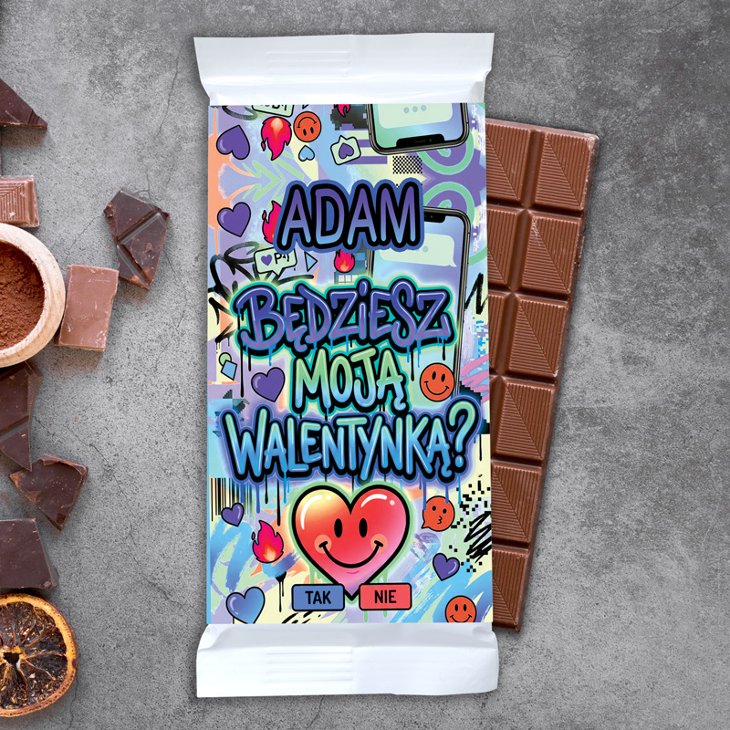 Czekolada zapakowana jest w papierową owijkę o nowoczesnym, graffiti-inspirowanym stylu, pełnym kolorów. Znajduje się na niej imię osoby, której zadajemy pytanie, co czyni prezent bardziej osobistym. Tło pokryte jest elementami w stylu pop-art: serduszka, uśmiechy i ikony, które idealnie oddają klimat miłości i romantycznego flirtu. Centralnym punktem jest kolorowy napis „Będziesz moją Walentynką?” oraz zabawna grafika serca z uśmiechem i przyciskami „tak” i „nie”. W środku znajduje się klasyczna, mleczna tabliczka czekolady, która zachwyci smakiem każdego łasucha. Całość to gotowy do wręczenia prezent, który nie wymaga dodatkowego pakowania.