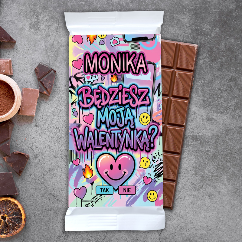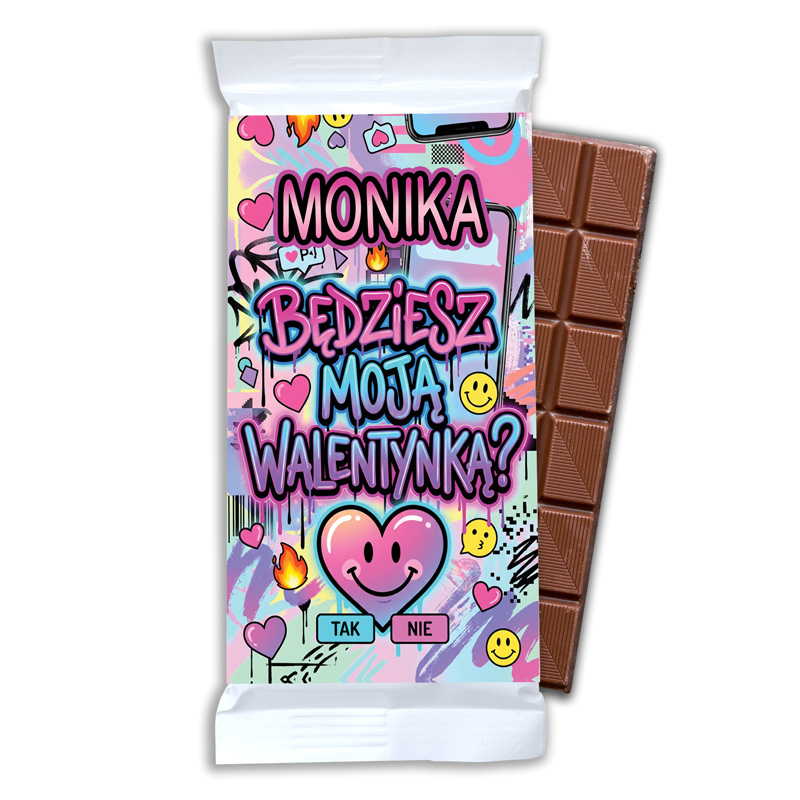 - na jednej stronie umieściliśmy grafikę, na której widnieje unoszący się w niebiosach, zakochany aniołek, trzymający w ręce wielkie kochające serce i otoczony chmurkami i małymi słodziutkimi serduszkami. Poniżej znajduje się napis: Będziesz moją walentynką? Powyżej aniołka znajduje się imię wybranej osoby, dzięki temu podarunek nabiera osobistego charakteru,