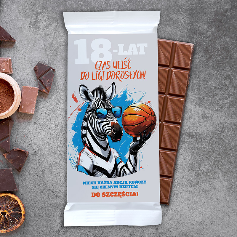 Opakowanie czekolady z ilustracją zebry w okularach przeciwsłonecznych trzymającej piłkę koszykową, z napisem "18-LAT CZAS WEJŚĆ DO LIGI DOROSŁYCH!" oraz dodatkowym tekstem "NIECH KAŻDA AKCJA KOŃCZY SIĘ CELNYM RZUTEM DO SZCZĘŚCIA!".