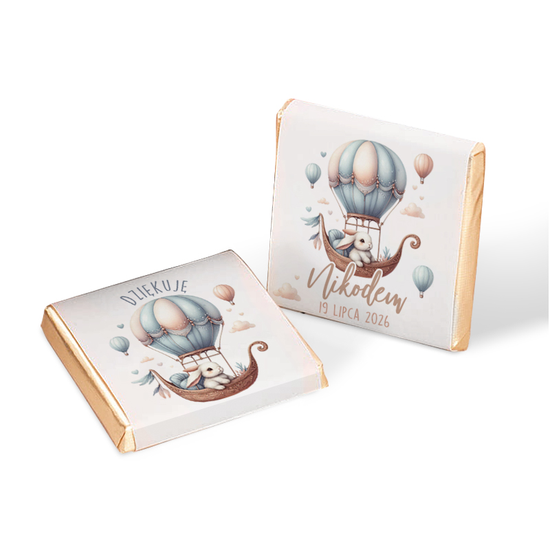 Personalizowane czekoladki dla gości z motywem króliczka w balonie to subtelny i elegancki dodatek, który pięknie uzupełni oprawę dziecięcej uroczystości – urodzin, roczku czy innego ważnego dnia. Każda mleczna czekoladka została owinięta w złote sreberko, a następnie ozdobiona etykietą utrzymaną w pastelowej kolorystyce. Na przodzie znajduje się imię dziecka oraz data wydarzenia, a całość uzupełnia ilustracja balonu z uroczym króliczkiem siedzącym w koszu. Tył etykiety zdobi napis „Dziękuję”, dzięki czemu słodkość pełni również rolę symbolicznego upominku wdzięczności dla gości.