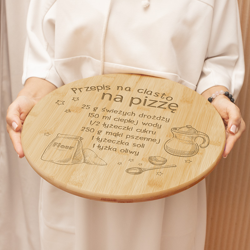 Drewniana deska do pizzy z wygrawerowanym przepisem ma średnicę 35 cm. Jest wykonana z drewna bambusowego, jest obrotowa i zabezpieczają ją stopery antypoślizgowe. Na powierzchni deski znajduje się napis, który jest przepisem na pizzę. Dekoracyjne napisy i grafiki na powierzchni wykonujemy grawerem, dlatego zachowa swoją trwałość na długie lata. Wykorzystaj naszą propozycję i zaskocz wszystkich niebanalnym podarunkiem, który wywoła uśmiech na twarzy. Stawiamy na szybką i bezproblemową realizację, dlatego czas oczekiwania to zaledwie 4 dni robocze.