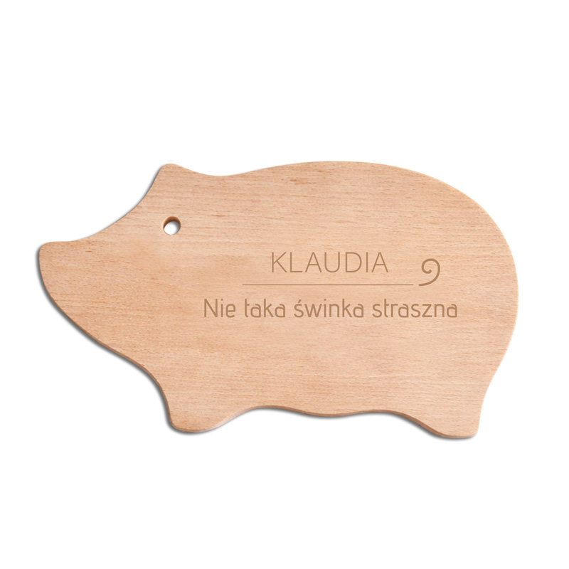Deska została wykonana z naturalnego drewna, dzięki temu jest trwała, ekologiczna i odpowiednia do kontaktu z żywnością. Deska przyciąga uwagę nietypowym kształtem świnki, który w połączeniu z dowcipnym tekstem „Nie taka świnka straszna” tworzy zabawną i przyjazną formę. Całość dopełnia personalizowane imię.  Minimalistyczna czcionka oraz czytelny układ tekstu sprawiają, że całość prezentuje się nowocześnie i estetycznie, dlatego pasuje do różnych stylów wnętrz. Kształt świnki nadaje jej charakteru i sprawia, że może pełnić funkcję dekoracyjną.