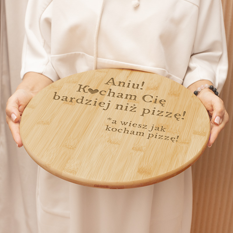 Deska do pizzy z grawerem stworzona została z wysokiej jakości drewna bambusowego. Dzięki temu jest odporna na różnego rodzaju uszkodzenia i wysokie temperatury. Z powodzeniem możesz ją umyć pod bieżącą wodą i wykorzystać ponownie. Całość produktu zdobi dedykacja, którą dla ciebie wygrawerujemy. Napis brzmi: (imię) Kocham Cię bardziej niż pizzę! Istotnym elementem jest podpis dołączony jako post scriptum: *a wiesz, jak kocham pizzę! W pełni personalizowana i funkcjonalna deska do pizzy z grawerem doskonale nadaje się jako element, na którym z powodzeniem można umieścić dobrze wypieczoną pizzę. Dodatkowo nieco zabawny napis wyrażający uczucia do ukochanej lub ukochanego i jedzenia z pewnością przypadnie każdemu do gustu. Nie ważne, czy to walentynki, wasza rocznica, czy zwykły dzień bez większej okazji. Szczere słowa prosto z serca zawsze warto powiedzieć. Deska z bambusa, obrotowa do serwowania pizzy. Na środku znajduje się personalizowany grawer, dzięki czemu idealnie się sprawdzi jako upominek na walentynki.