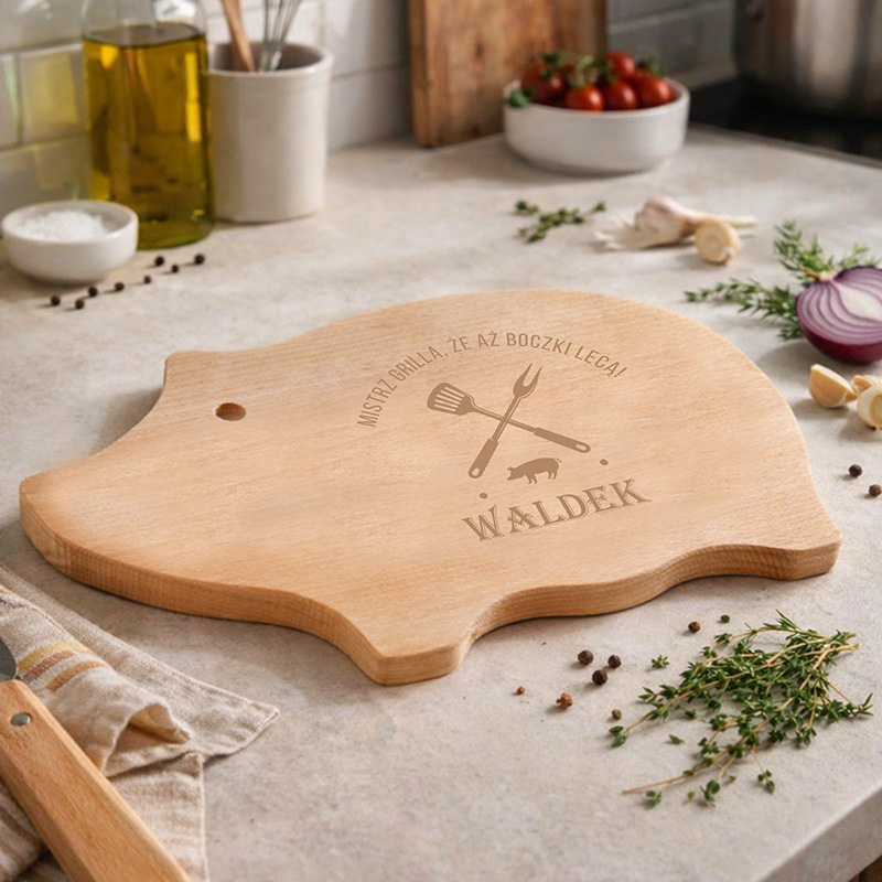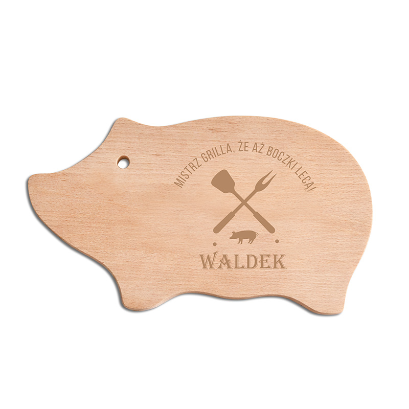 Deska wykonana jest z drewna, doskonale sprawdzi się do krojenia, serwowania mięs, wędlin czy przekąsek. Drewniana deska jest w kształcie świnki, charakteryzuje się personalizacją w postaci imienia. Na niej umieścimy również napis: „Mistrz grilla, że aż boczki lecą!”. Wygodny otwór umożliwia zawieszenie deski, dzięki czemu może pełnić także funkcję dekoracyjną w kuchni lub altanie.