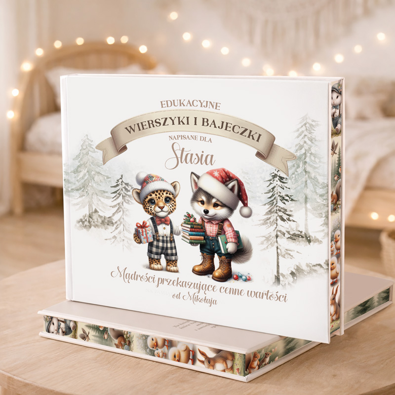 Przenieś się do zaczarowanej zimowej krainy pełnej uroku i świątecznego ciepła! Na okładce znajdują się dwa urocze zwierzątka, które wpatrują się w siebie z ciepłem i przyjaźnią. Całość otacza malowniczy zimowy pejzaż. Nad tą uroczą sceną widnieje piękny napis ,, Edukacyjne Wierszyki i bajeczki”. Poniżej, znajduje się przestrzeń na imię dziecka, które uczyni tę okładkę niepowtarzalną i osobistą. Pod grafiką zaplanowano miejsce na indywidualny podpis – przestrzeń, która pozwoli spersonalizować okładkę i dodać jej osobistego uroku. Idealna jako prezent lub wyjątkowy dodatek do zimowych wspomnień!
