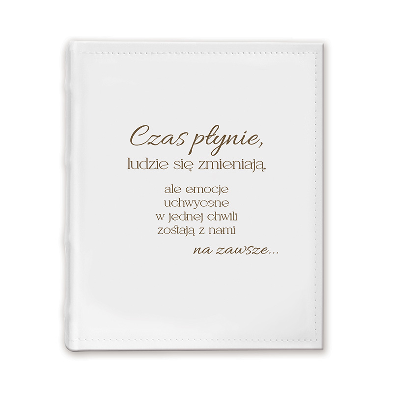 Wyjątkowa propozycja dla osób, które pragną zatrzymać ulotne chwile w klasycznej i ponadczasowej formie. Jego minimalistyczna, jasna okładka została wzbogacona o zdobny cytat: „Czas płynie, ludzie się zmieniają, ale emocje uchwycone w jednej chwili zostają z nami na zawsze…”, który nadaje całości emocjonalnego tonu i czyni z albumu nie tylko praktyczny produkt, ale też wzruszającą pamiątkę. Dzięki subtelnej estetyce album doskonale wpisuje się w klimat rodzinnych wspomnień oraz celebracji ważnych momentów.