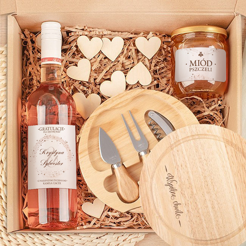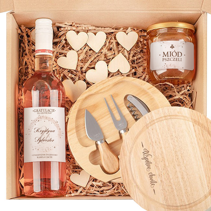 Box został przygotowany z myślą o tym, aby zachwycić nowożeńców i sprawić, że poczują się naprawdę wyjątkowo. Całość zapakowana jest w pudełko wypełnione ozdobnym wypełnieniem oraz drewnianymi elementami w kształcie serduszek. Wnętrze zestawu skrywa starannie dobrane produkty, które tworzą spójną całość. Pierwszym elementem zestawu jest praktyczny zestaw akcesoriów do sera z drewnianą deską z grawerem „Wspólne chwile”. W komplecie znajdują się nóż, widelec do sera oraz korkociąg – akcesoria, które sprawdzą się podczas wspólnych kolacji i spotkań przy winie. Dodatkowo w zestawie znalazła się również personalizowana etykieta na wino. Widnieją na niej imiona młodej pary oraz podpis osób wręczających prezent. Ponadto w zestawie znalazł się naturalny miód w szklanym słoiku z ozdobną etykietą.