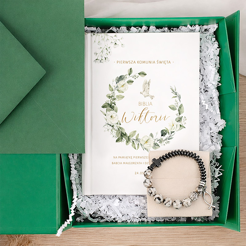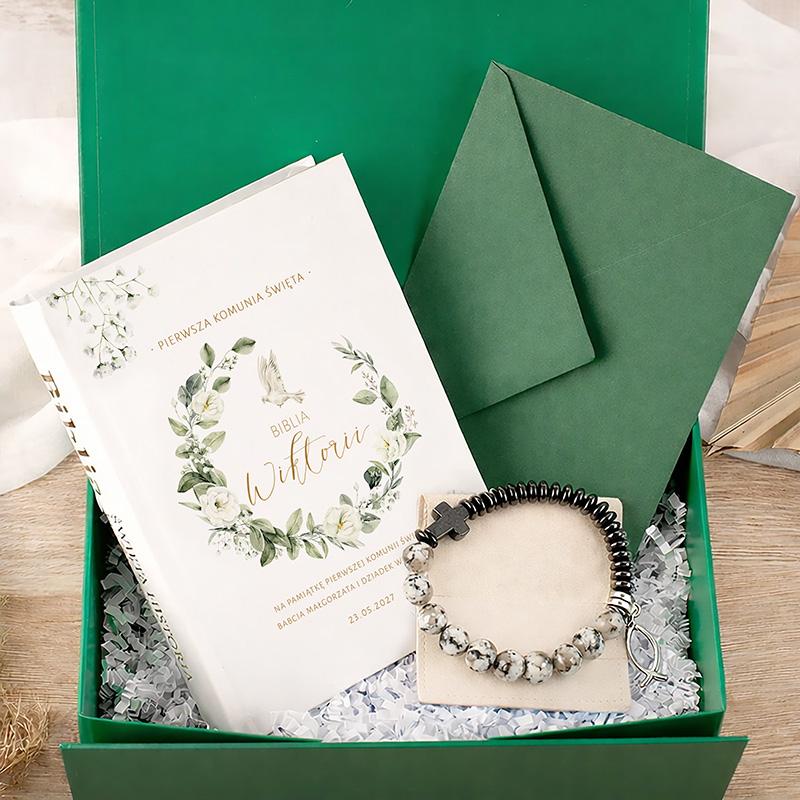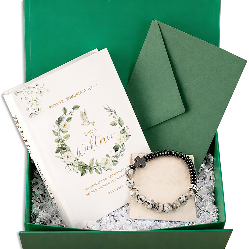 Zestaw komunijny zapakowany w solidne, zielone pudełko z imieniem dziecka, wykonane z wysokiej jakości materiałów, zamykane na magnes. Na jego wieczku widnieje złoty, elegancki napis, który podkreśla indywidualny charakter upominku. Dzięki temu prezent nabiera osobistego znaczenia i wyróżnia się spośród standardowych podarunków. W środku znajduje się personalizowana Biblia, idealna dla dziecka przystępującego do sakramentu. Jej okładkę zdobi subtelna ilustracja wieńca z białych kwiatów, symbolizujących czystość i duchowy rozwój. Na froncie umieszczono imię obdarowanej osoby oraz datę Komunii, co czyni książkę wyjątkową pamiątką na całe życie. Strony wykonano z wysokiej jakości papieru, a czytelna czcionka sprawia, że lektura jest przyjemna i komfortowa. Dodatkowy element zestawu to bransoletka wykonana z naturalnych kamieni, ozdobiona delikatnym krzyżykiem. Jej subtelny design sprawia, że pasuje zarówno do codziennych stylizacji, jak i uroczystych okazji. Całość dopełnia koperta na życzenia, która umożliwia dołączenie osobistego przekazu dla dziecka.