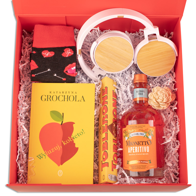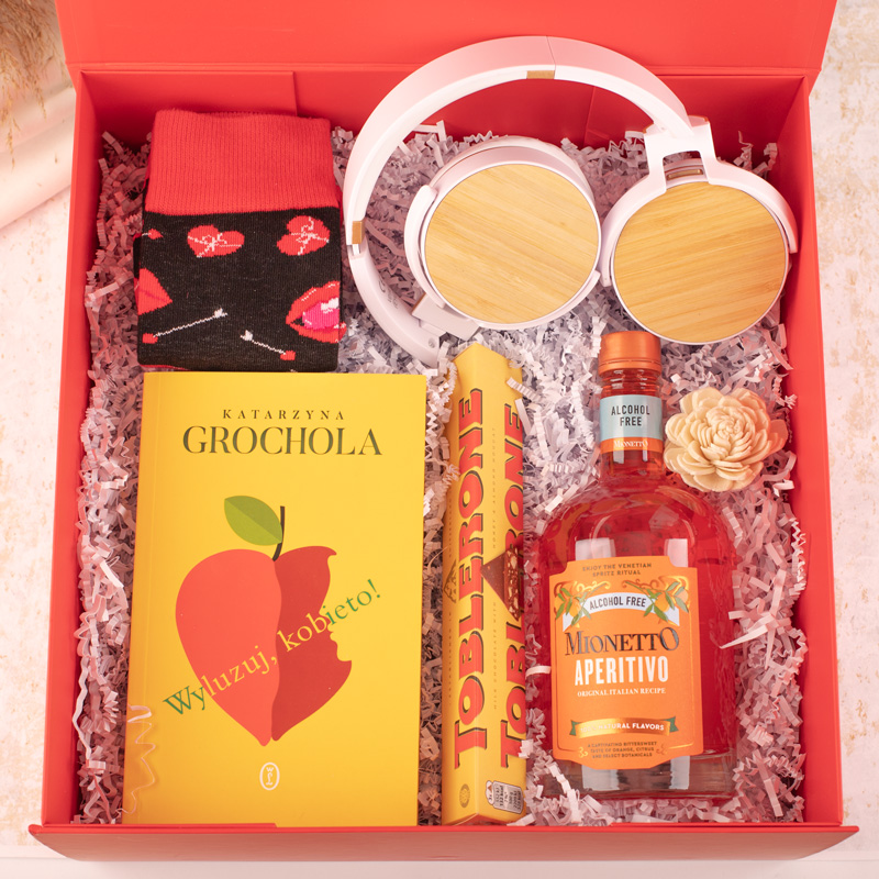 Starannie skomponowany zestaw, uzupełniają tabliczka czekolady Toblerone, butelka Mionetto Aperitivo bezalkoholowe, nowoczesne słuchawki z bambusowym wykończeniem oraz zabawne skarpetki z motywem serc i ust. Idealnie sprawdzi się on jako prezent dla kobiety na urodziny, imieniny, Walentynki, Święta czy inne wyjątkowe okazje. Eleganckie opakowanie z personalizacją imienia sprawi, że to nie jest to jedynie zwykły upominek, ale także gest pełen emocji i indywidualnego charakteru.