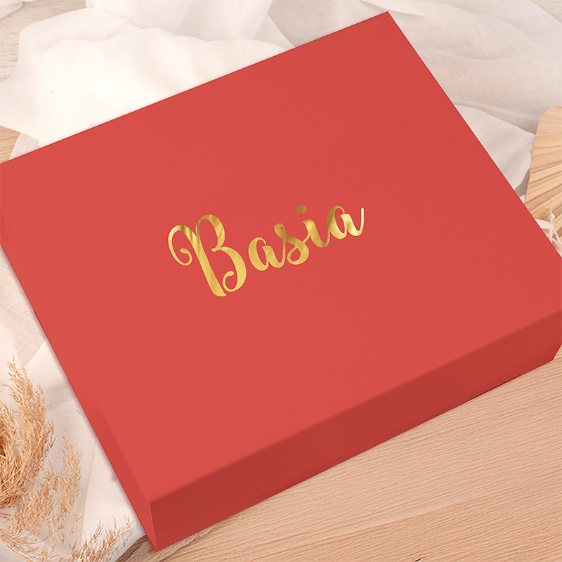 - Personalizowane, czerwone pudełko ze złotym nadrukiem imienia
