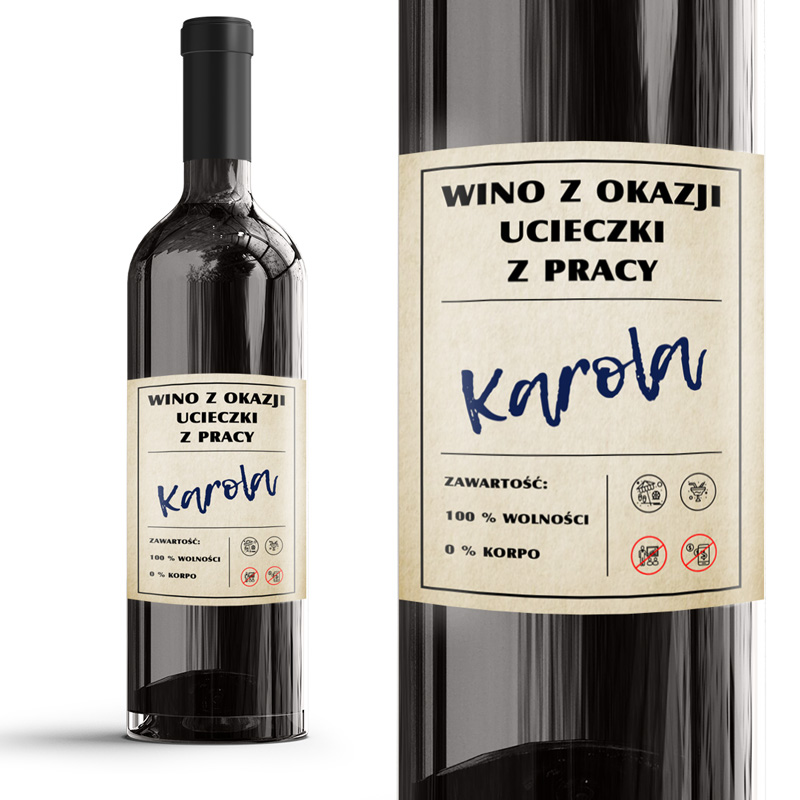 Etykieta przeznaczona jest do samodzielnego naklejenia na butelkę wina lub innego alkoholu. Projekt utrzymany jest w humorystycznym stylu, z wyraźnym hasłem nawiązującym do „ucieczki z korporacji” oraz personalizacją imienia. Całość uzupełniają zabawne piktogramy i teksty, takie jak „100% wolności” czy „0% korpo”, które nadają etykiecie lekki, ironiczny charakter. Dzięki personalizacji prezent staje się unikalny i dopasowany do konkretnej osoby, a zwykła butelka zamienia się w oryginalny upominek pożegnalny.