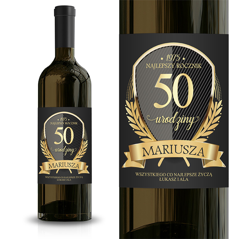• złoto-czarna kolorystka etykiety pasuje do okazji 50 urodzin dla mężczyzny, dlatego możecie ją podarować bliskiemu znajomemu jego ulubioną butelkę wina z urodzinową etykietą,