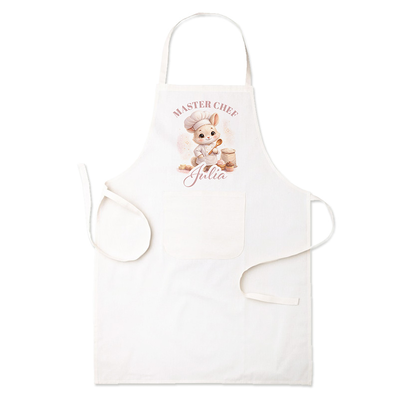 Na froncie fartucha znajduje się urocza ilustracja przedstawiająca króliczka w czapce kucharskiej. Bajkowa grafika z motywem pieczenia oraz napis „Master Chef” nadają fartuszkowi wyjątkowego charakteru. Dodatkowo na fartuszku umieszczone jest imię. Fartuch posiada klasyczny, wygodny krój. Praktyczna kieszonka z przodu pozwala przechowywać drobne akcesoria kuchenne, foremki do ciastek lub inne małe skarby potrzebne podczas gotowania.