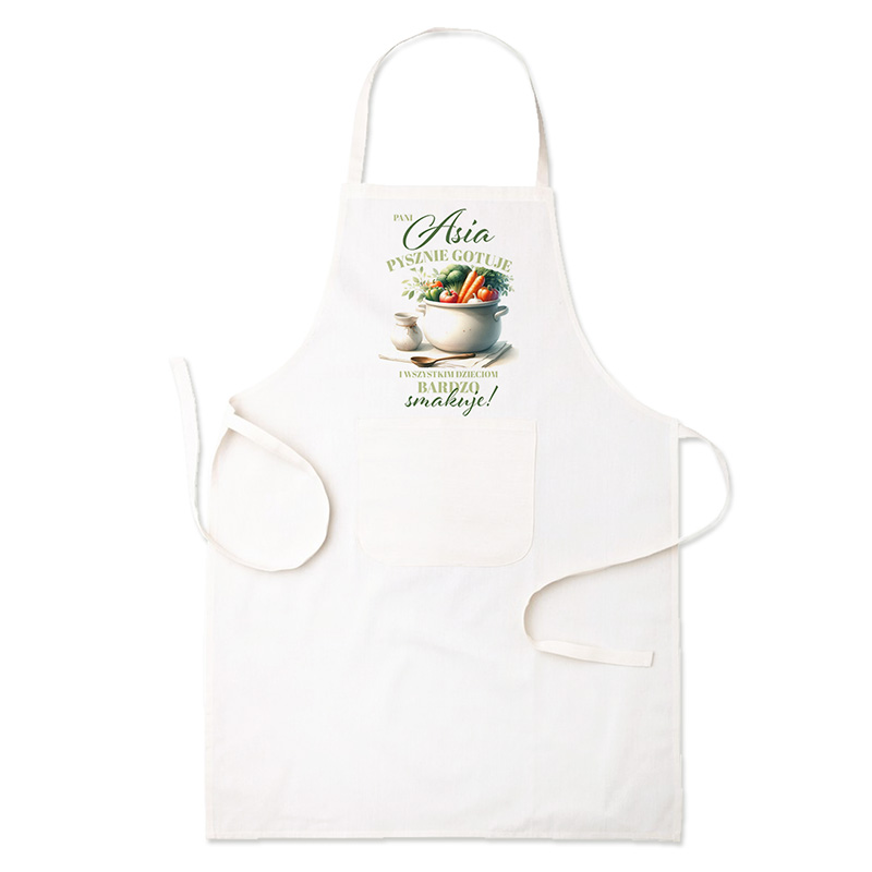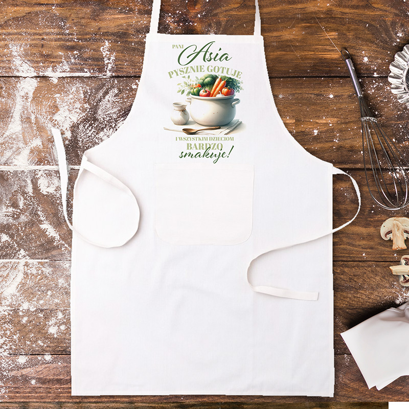 Fartuch kuchenny z imieniem to funkcjonalny element stroju kuchennego, który sprawdzi się podczas codziennego przygotowywania posiłków. Wykonany z lekkiego i wygodnego materiału, chroni ubranie przed zabrudzeniami i jednocześnie zapewnia komfort podczas pracy. Fartuch posiada kieszonkę. Na froncie znajduje się dekoracyjny nadruk z imieniem oraz napisem podkreślającym kulinarne umiejętności. Całość uzupełnia ilustracja przedstawiająca garnek pełen warzyw.