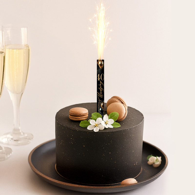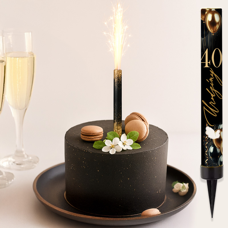 Fontanna tortowa na 40 urodziny 12 cm to efektowna dekoracja na tort, która świetnie urozmaici moment jego wniesienia i krojenia. Utrzymana w eleganckiej czarno-złotej kolorystyce, z nadrukiem balonów i napisem „40 urodziny”, idealnie pasuje do przyjęcia urodzinowego.