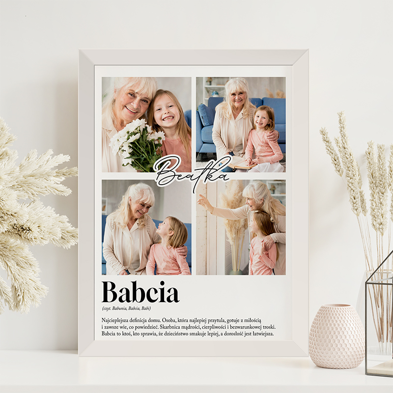 Plakat zawiera kompozycję czterech zdjęć, które tworzą spójną historię wspólnych chwil. Na środku znajduje się imię zapisane ozdobną czcionką, a poniżej wyraźna definicja słowa „Babcia” lub „Dziadek”, podkreślająca ich wyjątkową rolę w życiu rodziny. Całość oprawiona jest w estetyczną ramkę. Minimalistyczny design sprawia, że fotoplakat pasuje do każdego wnętrza.