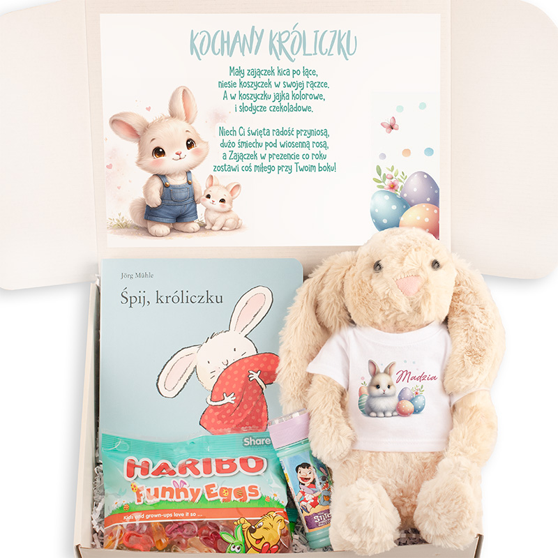 Centralnym elementem paczki jest miękki pluszowy zajączek ubrany w koszulkę z imieniem dziecka. Na koszulce znajduje się urocza ilustracja króliczka z wielkanocnymi pisankami, która nadaje maskotce bajkowy charakter. W zestawie znajduje się także książka dla dzieci „Śpij, króliczku”. To opowieść idealna do wspólnego czytania przed snem. Nie mogło również zabraknąć słodkiego elementu. W paczce znajdują się kolorowe żelki owocowe, które doskonale wpisują się w radosny, świąteczny klimat Wielkanocy. Dodatkową atrakcją są bańki mydlane, które doskonale sprawdzają się podczas wiosennych zabaw na świeżym powietrzu.