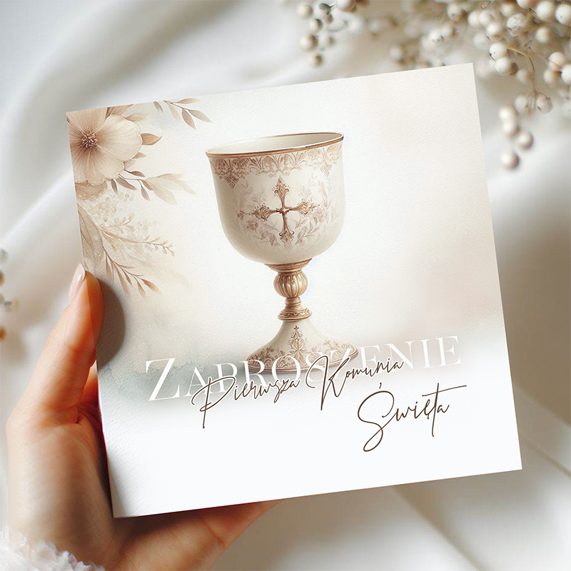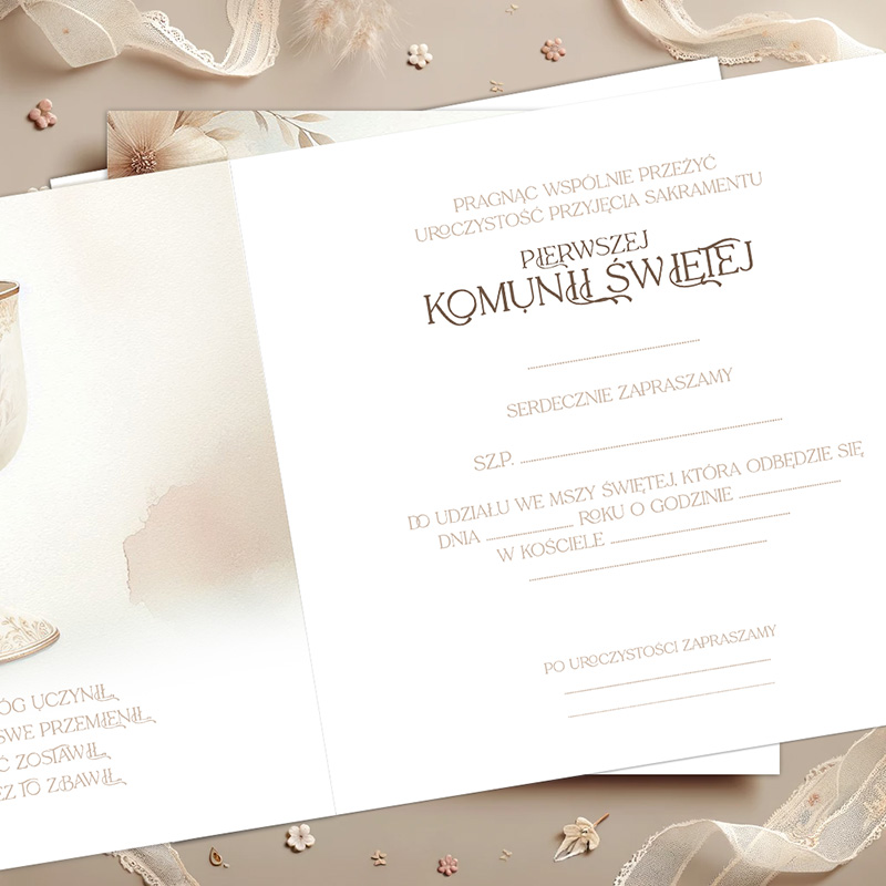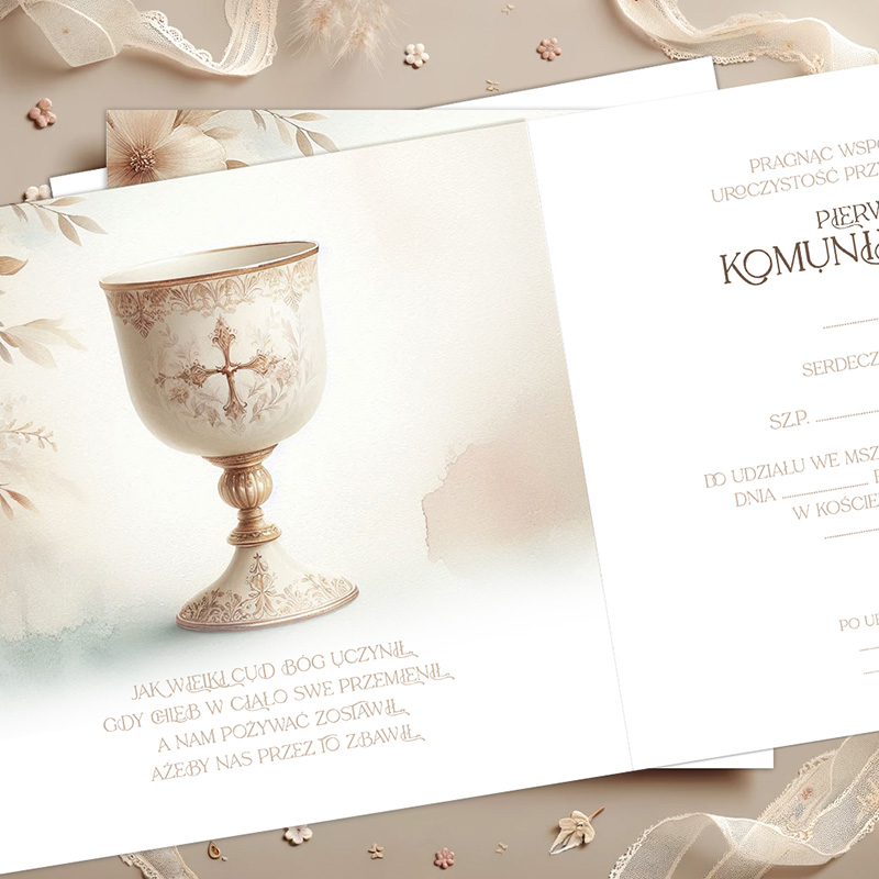 Na okładce zaproszenia znajduje się ozdobna grafika kielicha eucharystycznego oraz napis “Zaproszenie” i “Pierwsza Komunia Święta”. Całość tworzy bardzo elegancką kompozycję, idealnie wpisującą się w charakter komunii. Wewnątrz zaproszenia znajduje się gotowy tekst do uzupełnienia, dzięki czemu przygotowanie zaproszeń jest szybkie i wygodne. Przewidziano miejsce na wpisanie najważniejszych informacji, takich jak imię dziecka i osoby zaproszonej, data i godzina uroczystości oraz miejsce ceremonii i przyjęcia. Dodatkowo po lewej stronie umieszczony jest cytat: