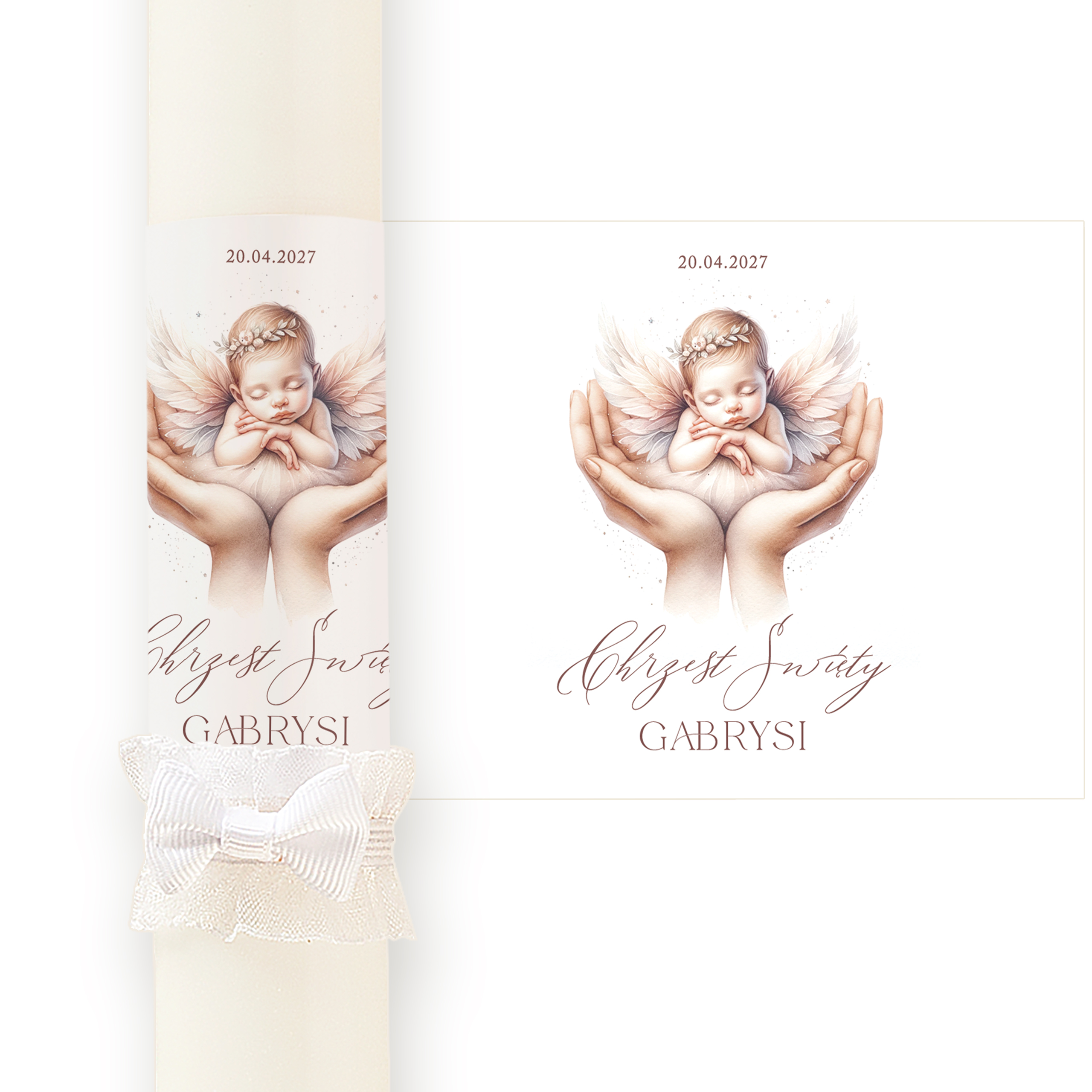 Wyjątkowa świeca chrzcielna stworzona z myślą o uroczystości Chrztu Świętego dziewczynki. Gromnica wyróżnia się subtelnym, pełnym symboliki wzorem – na etykiecie znajduje się urocza ilustracja śpiącego aniołka trzymanego w dłoniach. Nad grafiką znajduje się data uroczystości Chrztu Świętego i imię Twojego dziecka, co nadaje gromnicy osobistego wymiaru.