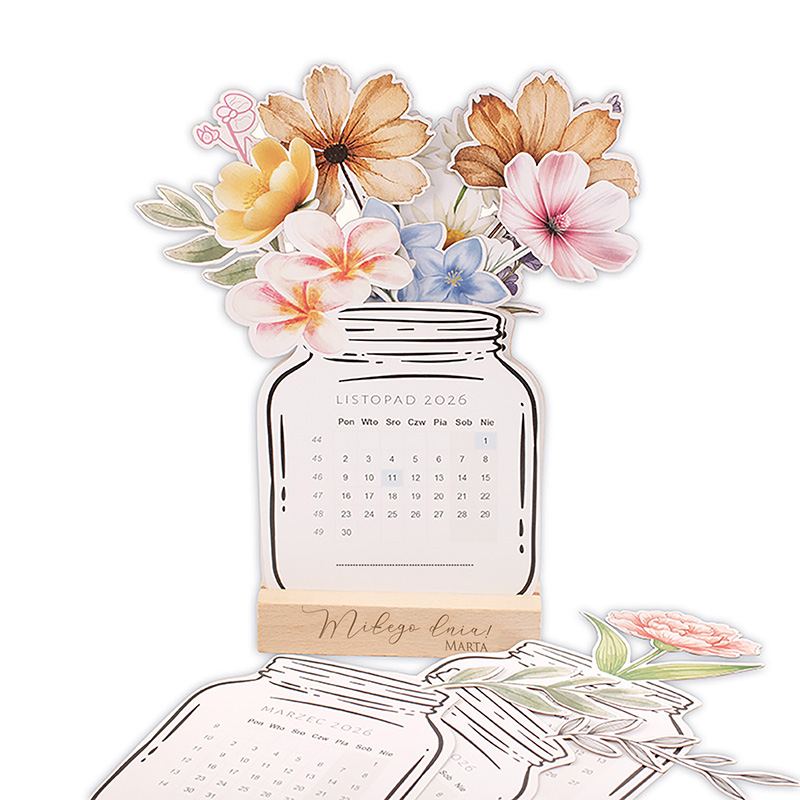 Kalendarz składa się z kart przedstawiających kolejne miesiące, ułożonych w formie bukietu kwiatów w słoiku. Każda karta prezentuje czytelny układ dni oraz spójną, kwiatową grafikę. Karty kalendarza posiadają na dole miejsce na dodatkowe zapiski – możesz zapisać tam ważną datę jak urodziny lub rocznicę. Całość umieszczona jest na solidnej, drewnianej podstawce z grawerem. Personalizacji podlega podstawka – możliwe jest dodanie imienia, co nadaje kalendarzowi osobistego charakteru.