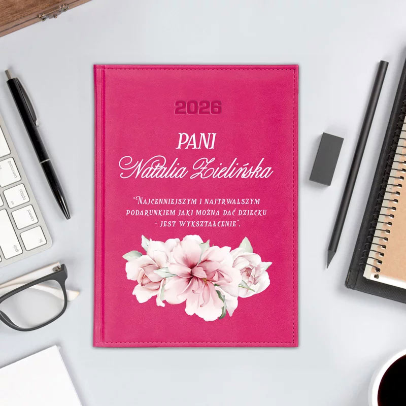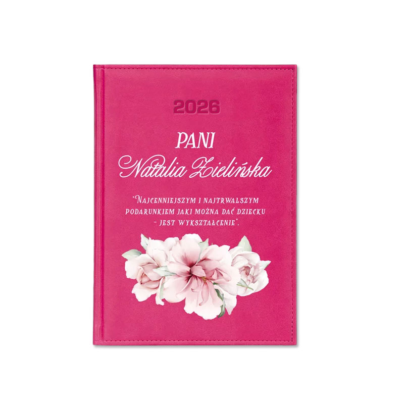 Praktyczny prezent dla nauczyciela, niezwykle elegancki planer książkowy. Terminarz w formacie A5, zawiera kalendarz tygodniowy z rozkładem godzinowym zajęć. Oprawa z eko skóry, do wyboru aż 6 wersji kolorystycznych. Na okładce znajduje się urocza kwiatowa dekoracja oraz imię i nazwisko nauczyciela. Nie zabraknie również cytatu: Najcenniejszym i najtrwalszym podarunkiem, jaki można dać dziecku – jest wykształcenie. Kalendarz dla nauczycielki w środku ma miejsce na dane personalne, skrócony kalendarz na 2026 rok oraz mapę z planem urlopowym i rozpiską na poszczególne dni w roku.