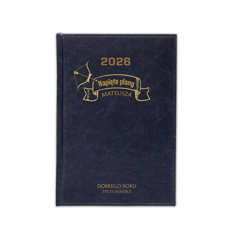 • okładka, posiada zdobienie  w formie eleganckiego nadruku, wykonanego w złotym kolorze: Napięte plany + imię obdarowanego,