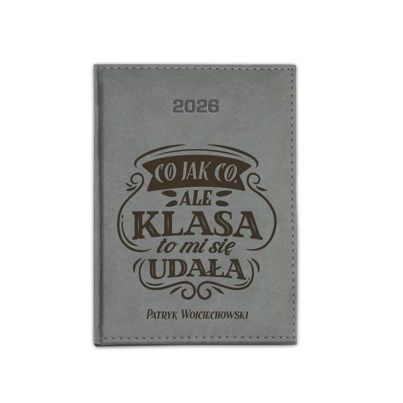 Kalendarz książkowy oprawiony w elegancką i trwałą okładkę z eko skóry. Na okładce znajduje się grawerowany napis: Co jak co, ale klasa to mi się udała oraz imię i nazwisko nauczyciela. Kalendarz dla wychowawcy oferujemy w sześciu pięknych kolorach do wyboru. Mały format sprawia, że jest on niezwykle praktyczny i bez problemu mieści się w małej torbie. Ten wyjątkowy, personalizowany terminarz książkowy zawiera między innymi planer urlopów, miejsce na dane personalne i skrócony kalendarz na 2026 rok.