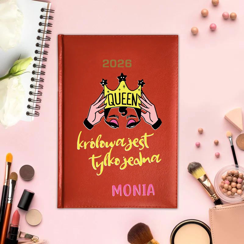 Kalendarz w formie książkowej formatu A5, dla przebojowej kobiety. Oprawiony w solidną, twardą okładkę z tłoczoną cyfrą z przodu, która symbolizuje rok. Wnętrze w kalendarzu wypełnia kalendarz z podziałem na dni, a te z kolei są dzielone na godziny. Idealny terminarz do notowania zadań i spraw do załatwienia, z uwzględnieniem konkretnej godziny. W środku znajduje się tasiemka, która ma służyć jak zakładka, do zaznaczenia konkretnej strony w kalendarzu. To, co czyni kalendarz wyjątkowym to jego personalizowane zdobienie na okładce, dzięki której nabiera on całkiem nowego znaczenia, a nawet przeznaczenia. Zaznaczone dosadnie imię właścicielki zobowiązuje ją do skrupulatnego prowadzenia zapisów i prowadzenia planu dnia. Każdy z kolei kto odważy się zerknąć na oprawę dowie się co nieco o właścicielce terminarza. Na okładce bowiem widnieje wyraźny, jaskrawożółty napis KRÓLOWA JEST TYLKO JEDNA.