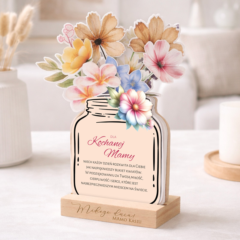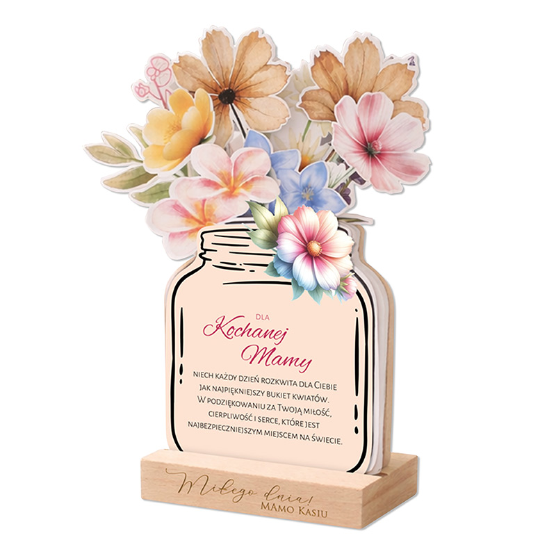 Kalendarz został zaprojektowany jako uniwersalny kalendarz 12-miesięczny, który może rozpoczynać się od dowolnie wybranego miesiąca. Dzięki temu doskonale sprawdzi się jako prezent wręczany o każdej porze roku. Karty kalendarza układają się w efektowną kompozycję kwiatów w formie bukietu, dzięki czemu całość pełni również funkcję estetycznej dekoracji wnętrza. Drewniana podstawka została wyposażona w grawer z imieniem. Czytelny układ dni zapewnia miejsce na notatki i zaznaczenie ważnych dat, a okładka z dedykacją na Dzień Mamy podkreśla wyjątkowy charakter okazji.
