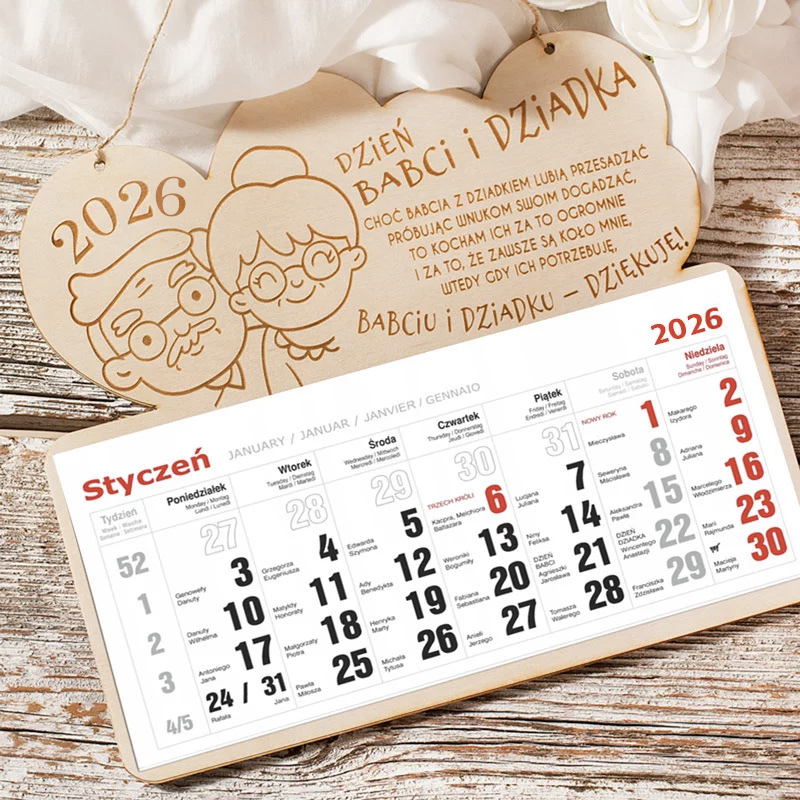 Kalendarz dla dziadków to znakomity podarunek dla nich z okazji święta Babci i Dziadka. Początek roku to czas, kiedy każdy wymienia kalendarz na nowy. W tym roku to Ty spraw dziadkom kalendarz, w oryginalnej wersji, z grawerem. Ciekawy format kalendarza będzie codziennie przypominał babci i dziadkowi, że mają wnuków, którzy bardzo ich kochają. Wygodny format z odrywanymi kartami miesięcy i dużymi cyframi będzie czytelny i wyraźny. Żadna wizyta u lekarza czy imieniny przyjaciółki nie zostaną przegapione. Wszystkie zapiski będą widoczne przez cały miesiąc. Dziadkowie zasługują na specjalne podziękowania za ich poświęcenie oraz zaangażowanie, dlatego tekst z życzeniami będzie dla nich także wyjątkowym wyróżnieniem. Drewniana podstawa kalendarza, na której umieścimy nadruk metodą grawerowania, będzie także wyjątkową dekoracją, która uświetni kuchnię lub przedpokój.