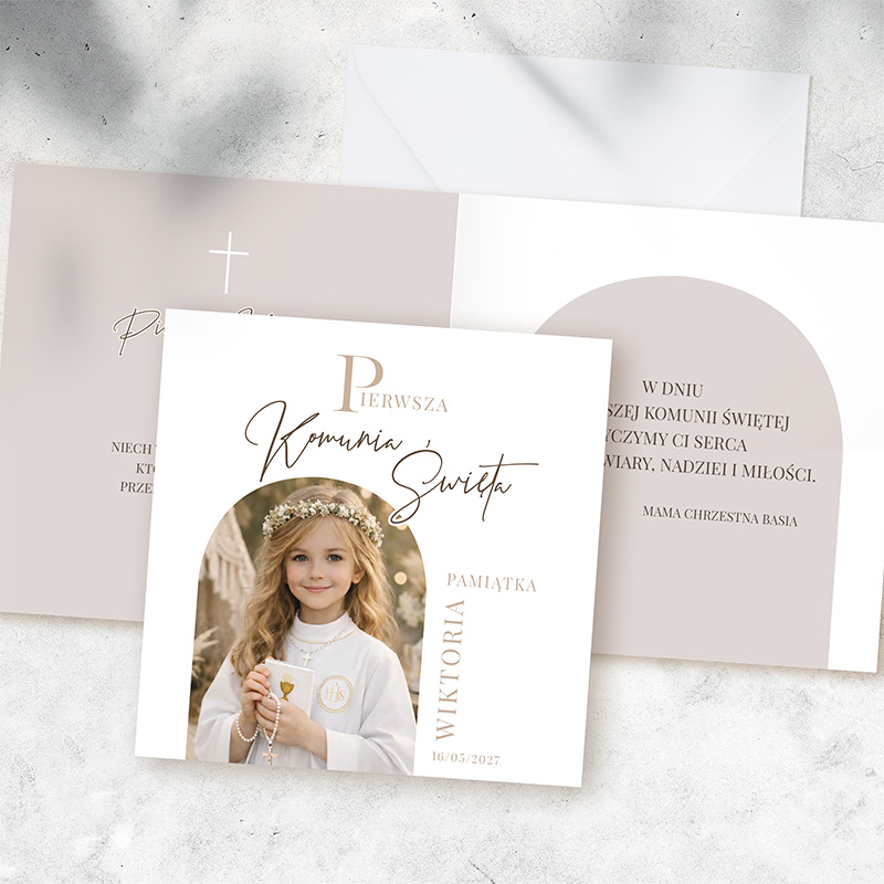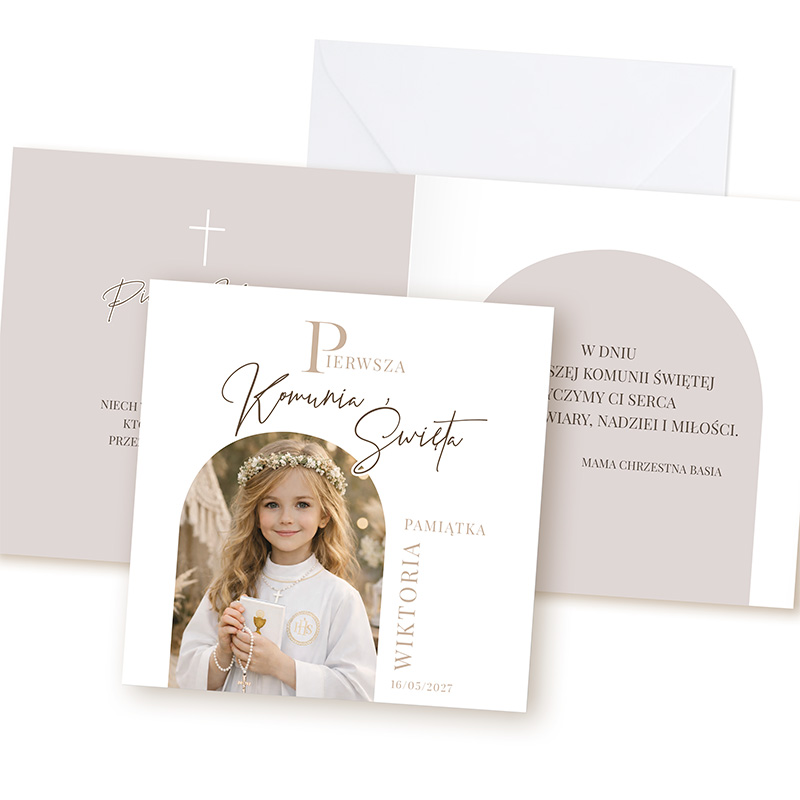 Na okładce znajduje się zdjęcie dziecka. Nad zdjęciem widnieje napis „Pierwsza Komunia Święta” wykonany ozdobną czcionką. Całość utrzymana jest w jasnej, stonowanej kolorystyce beżu i bieli, co podkreśla uroczysty charakter wydarzenia. Personalizowane poza zdjęciem jest także imię dziecka oraz data uroczystości, dzięki czemu kartka komunijna nabiera wyjątkowej wartości sentymentalnej. W środku znajdują się gotowe życzenia komunijne z personalizowanym podpisem osoby wręczającej, a całość uzupełnia biała koperta.