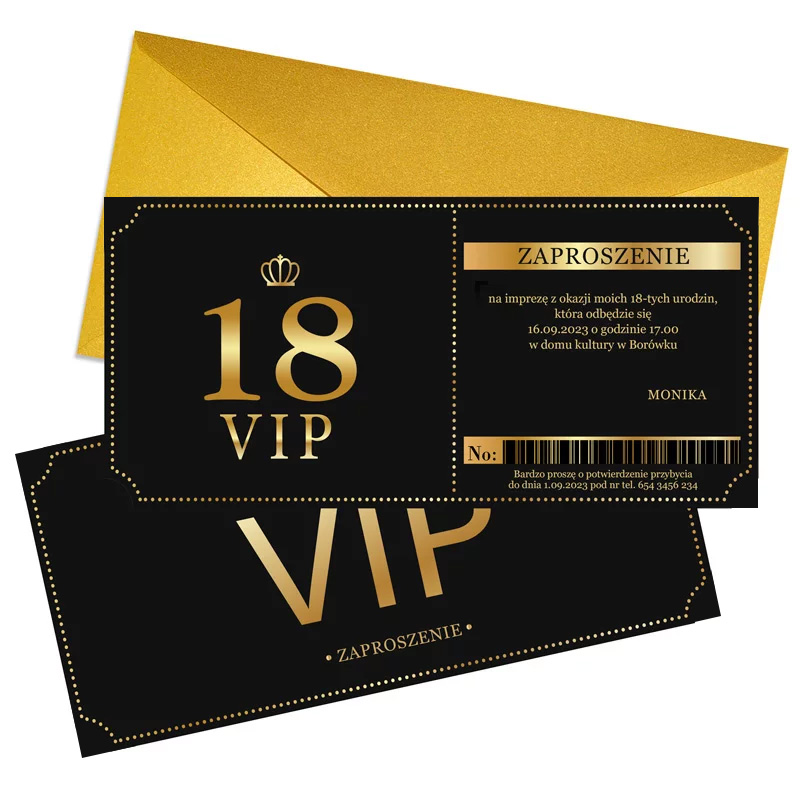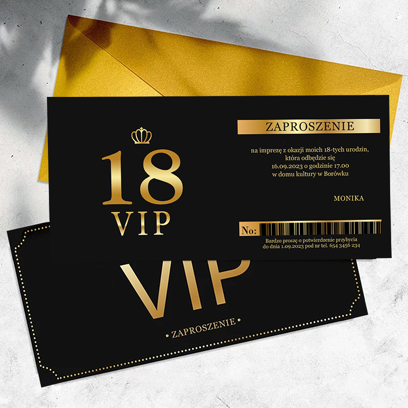 Dwustronne zaproszenie na 18 urodziny jak bilet VIP. Ma podłużny kształt, który kojarzy się z biletem na koncert. Na okładce znajduje się duży napis VIP ZAPROSZENIE, które na czarnym tle doskonale jest widoczne. Na odwrocie z kolei umieścimy treść Twojego zaproszenia, który należy wgrać przy produkcie lub wysłać do nas na pocztę e-mail. W części z Twoim tekstem zaproszenia znajduje się złoty pas z napisem ZAPROSZENIE. Słowo poprzedzi część właściwą z podanymi o dacie imprezy informacjami. Na bilecie znajdzie się również grafika, która przypomina kod kreskowy, który znajduje się w rzeczywistości na każdej imprezowej wejściówce. W zestawie jest także złota, podłużna koperta.