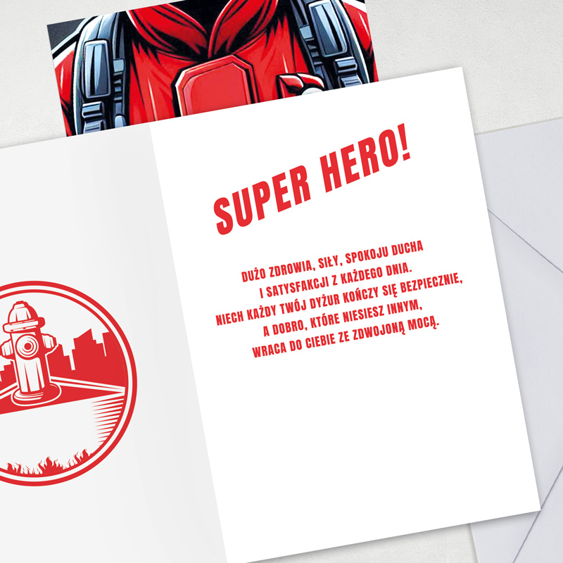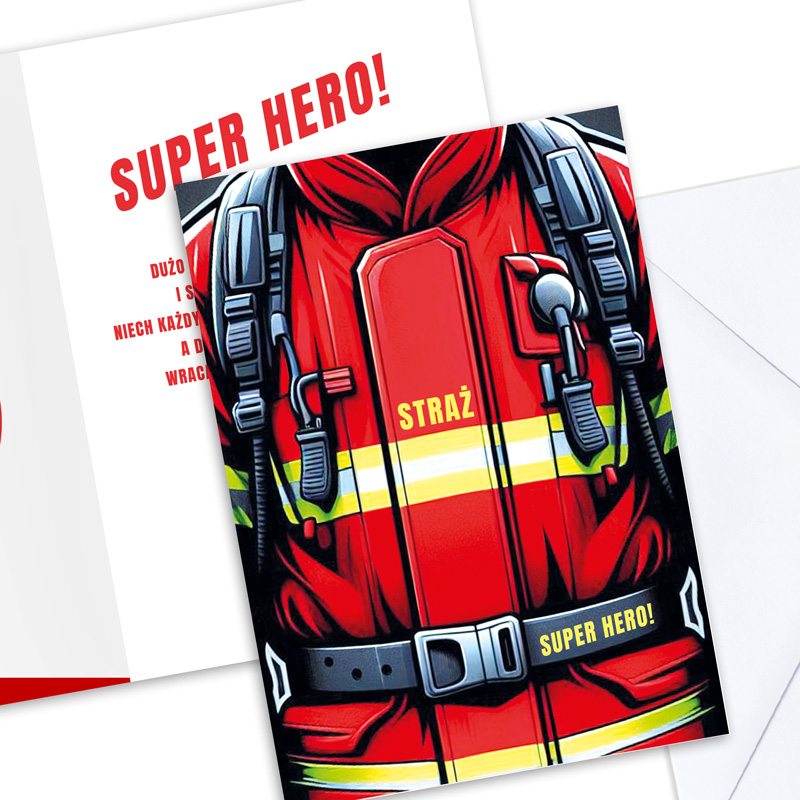 Na zewnętrznej stronie kartki znajduje się dynamiczna grafika przedstawiająca strój strażaka – czerwony mundur z pasami odblaskowymi, elementami wyposażenia oraz napisem „STRAŻ”. Wnętrze kartki zawiera gotowe życzenia, które zostały zaprojektowane w wyrazistej, czerwonej typografii. Główny napis „SUPER HERO!” przyciąga uwagę i nadaje całości charakteru. W zestawie znajduje się dopasowana koperta.