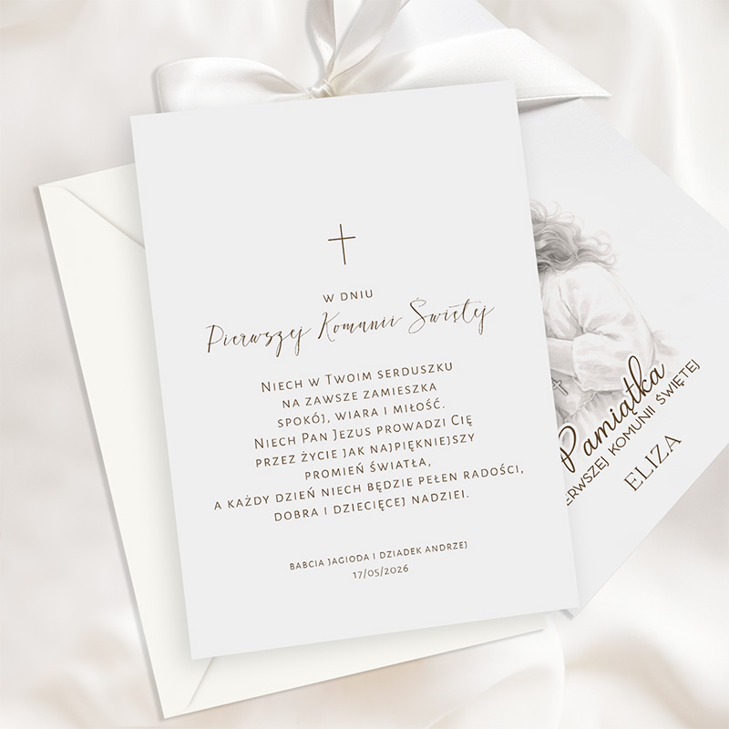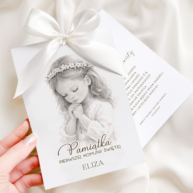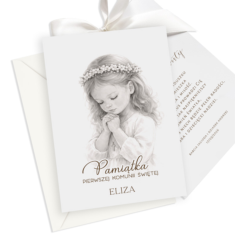 Kartka została wykonana z wysokiej jakości papieru. Front kartki przedstawia ilustrację modlącej się dziewczynki. Grafika utrzymana jest w delikatnych odcieniach szarości, dzięki czemu prezentuje się niezwykle elegancko. Pod obrazkiem znajduje się napis: „Pamiątka Pierwszej Komunii Świętej” oraz personalizowane imię, które sprawia, że kartka staje się jeszcze bardziej osobista i wyjątkowa. Druga karta zawiera życzenia, które przekazują duchowe wsparcie i miłość. Pod tekstem znajduje się personalizowany podpis oraz data uroczystości. Całość została przewiązana elegancką satynową wstążką w kolorze białym.