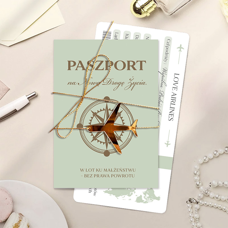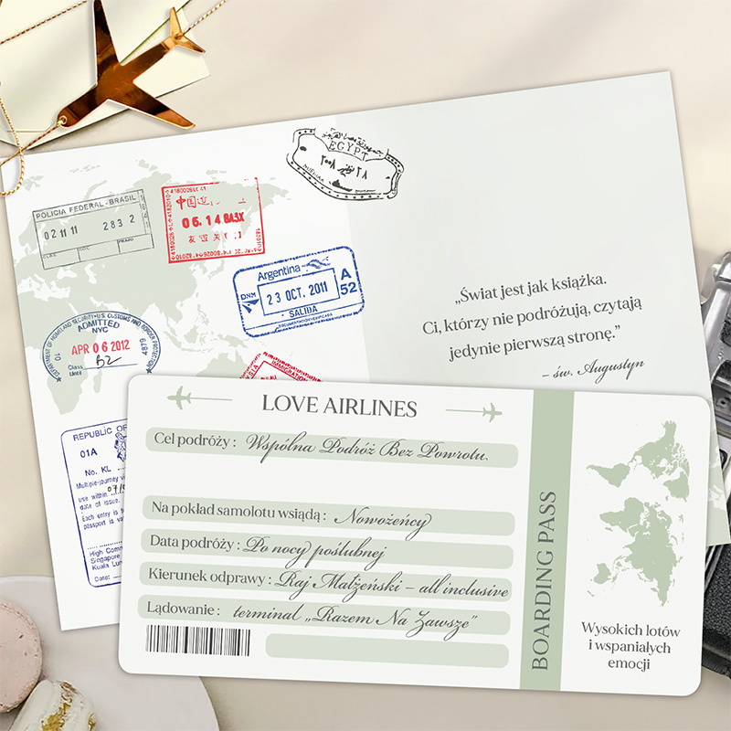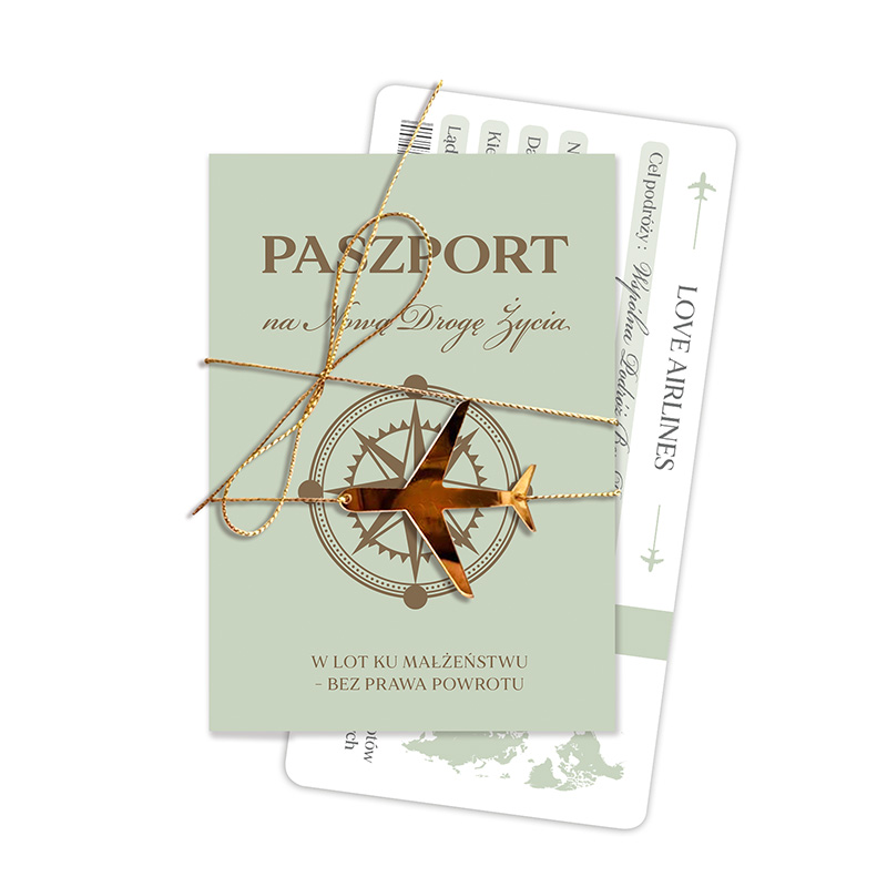 Kartka została zaprojektowana z najwyższą dbałością. Przypomina paszport z eleganckim nadrukiem „Na Nową Drogę Życia”, a całość uzupełnia złota zawieszka w kształcie samolotu, symbolizująca wspólną podróż. Do zestawu dołączony jest również stylizowany bilet lotniczy linii Love Airlines, który zawiera szczegóły takie jak: cel podróży – Wspólna Podróż Bez Powrotu, miejsce lądowania – Razem na Zawsze, czy odprawa do Raju Małżeńskiego – all inclusive. W środku kartki widnieje mapa świata z odciśniętymi pieczątkami z różnych krajów. Na kartce znajdziemy również wolne miejsce na podpis.