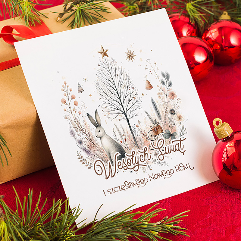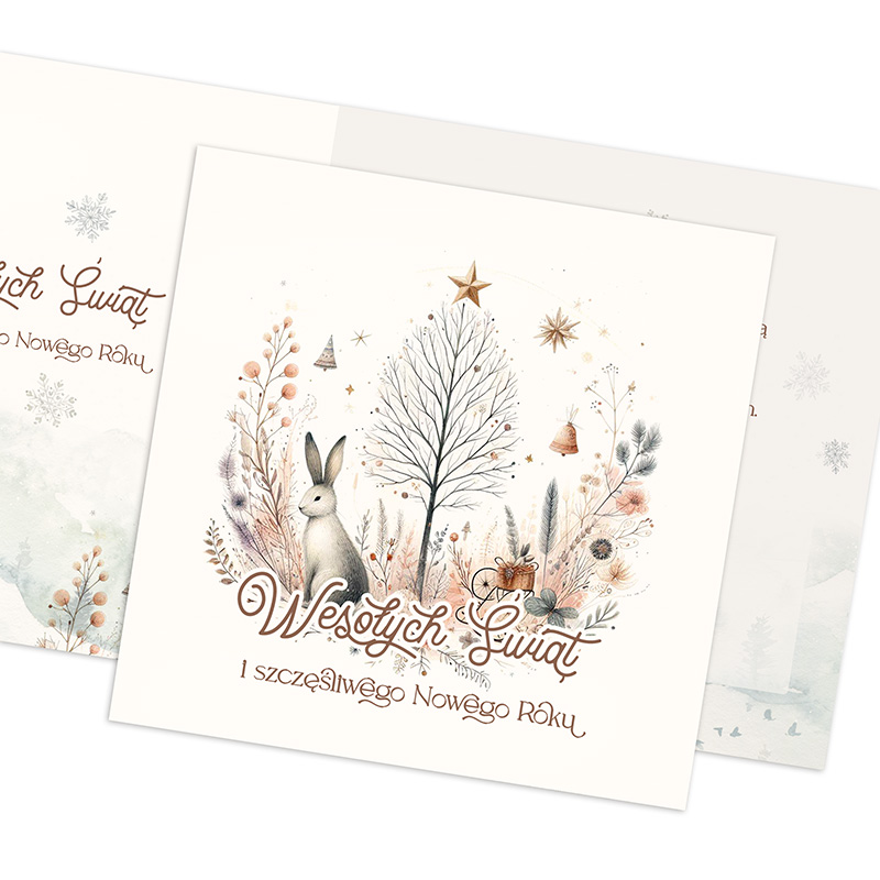 Elegancka kartka świąteczna z życzeniami firmowymi to produkt wyjątkowy, który wyróżnia się delikatną grafiką z motywem leśnym – zajączek w otoczeniu zimowych gałązek, drzewek, gwiazdek i świątecznych akcentów. Utrzymana jest w ciepłej kolorystyce beżu, brązu i pastelowych akcentów. Wewnątrz znajduje się gotowy tekst życzeń bożonarodzeniowych i noworocznych: