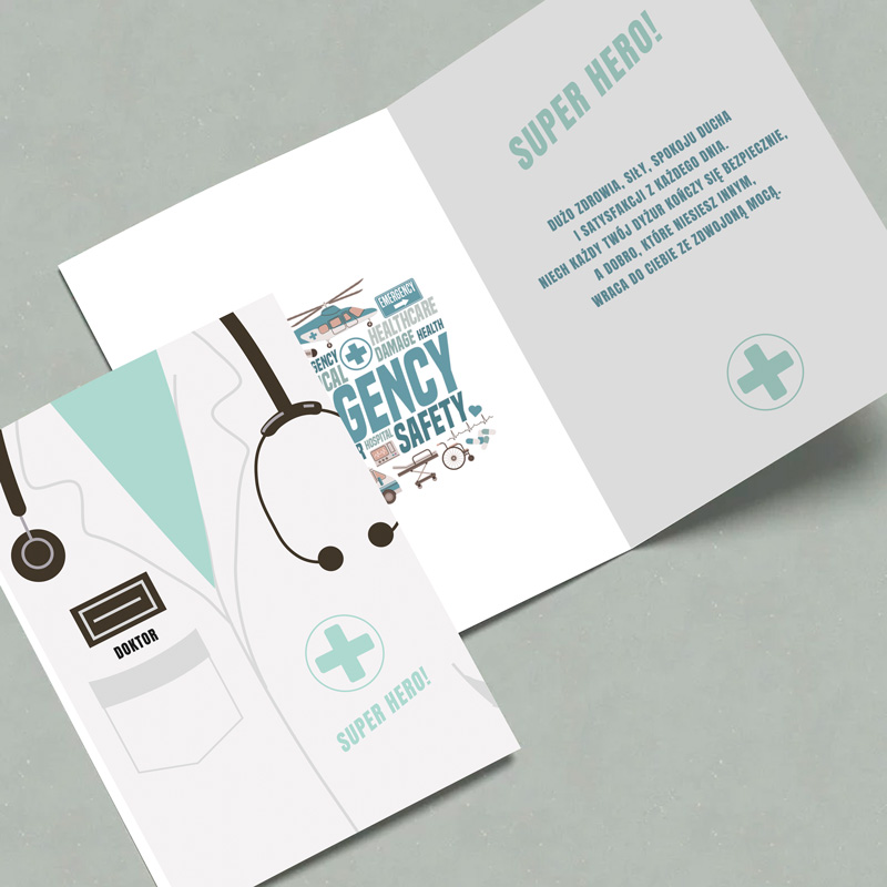 Kartka z życzeniami dla lekarza „Super Hero!” z przednią stroną przypominającą lekarski fartuch oraz ilustracją stetoskopu. Całość dopełnia napis „DOKTOR” i hasło „SUPER HERO!” oraz gotowe życzenia znajdujące się w środku kartki. Idealna na Dzień Lekarza, jubileusz, awans lub jako forma podziękowania po zakończeniu leczenia.