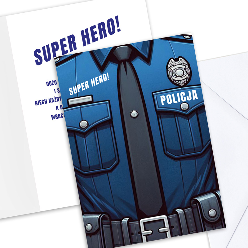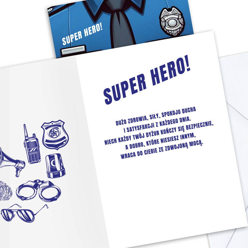Kartka utrzymana jest w dominujących odcieniach granatu i niebieskiego, które idealnie oddają kolorystykę policyjnego munduru. Wewnątrz, po jednej stronie widoczna jest grafika związana z pracą policjanta. Elementy takie jak kajdanki, krótkofalówka czy odznaka tworzą spójną kompozycję. Druga strona zawiera gotowe życzenia: