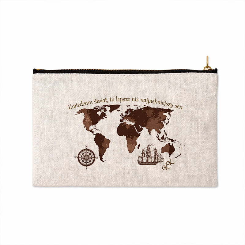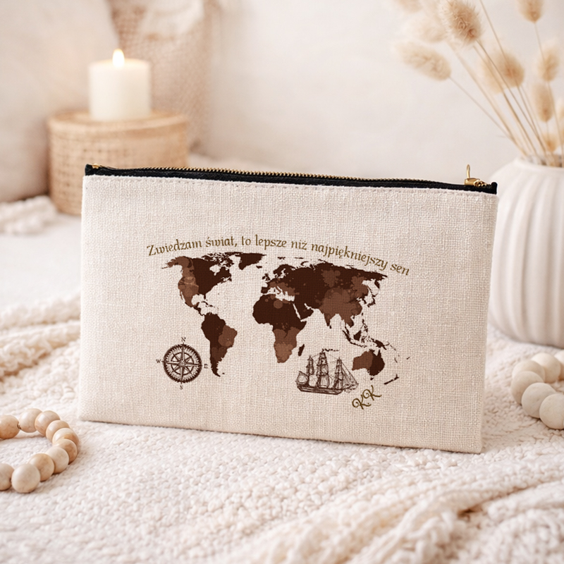 Kosmetyczka jest wyposażona w solidny zamek, który zabezpiecza jej zawartość, dzięki czemu jest idealna do przechowywania kosmetyków i innych podręcznych akcesoriów. Jej kompaktowy rozmiar sprawia, że z łatwością zmieści się w walizce, plecaku czy torbie, co czyni ją niezastąpionym towarzyszem każdej podróży. Grafika kosmetyczki będzie dodatkowo wzbogacona inicjałami Podróżnika!