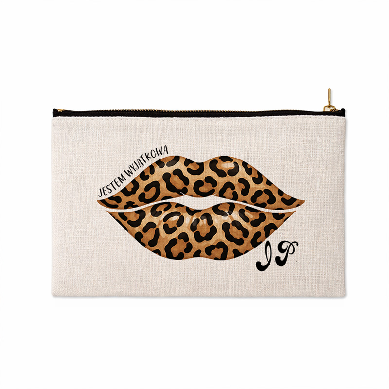 Kosmetyczka została wykonana z materiału w jasnym, naturalnym odcieniu. Centralnym elementem projektu jest grafika ust we wzorze panterki. Wyrazisty motyw w odcieniach brązu i czerni przyciąga wzrok i nadaje kosmetyczce wyjątkowego charakteru. Nad grafiką znajduje się napis „Jestem wyjątkowa”. Uzupełnieniem projektu są personalizowane inicjały, umieszczone w eleganckim kroju pisma. Kosmetyczka jest bardzo praktyczna. Bez problemu pomieści najpotrzebniejsze kosmetyki, drobiazgi czy biżuterię. Świetnie sprawdzi się zarówno w codziennym użytkowaniu – w torebce czy plecaku – jak i podczas wyjazdów, wakacji czy weekendowych wypadów.